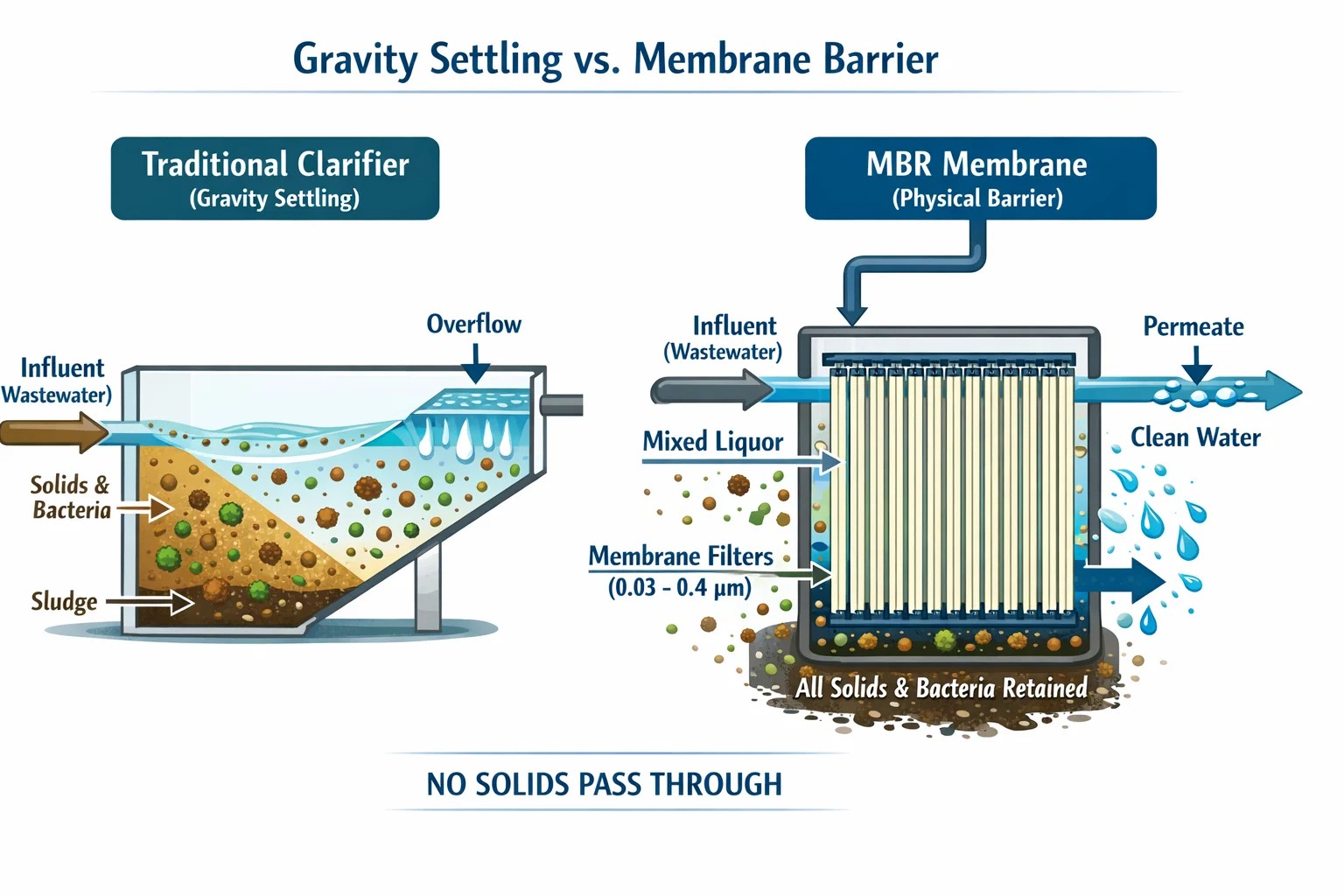 I et konvensjonelt anlegg er du begrenset av hvor raskt en partikkel kan synke. I en MBR bruker vi en fysisk membranbarriere (typisk 0,03 til 0,4 μm).